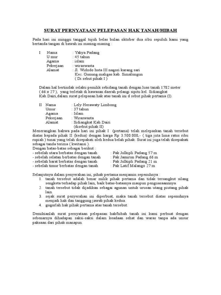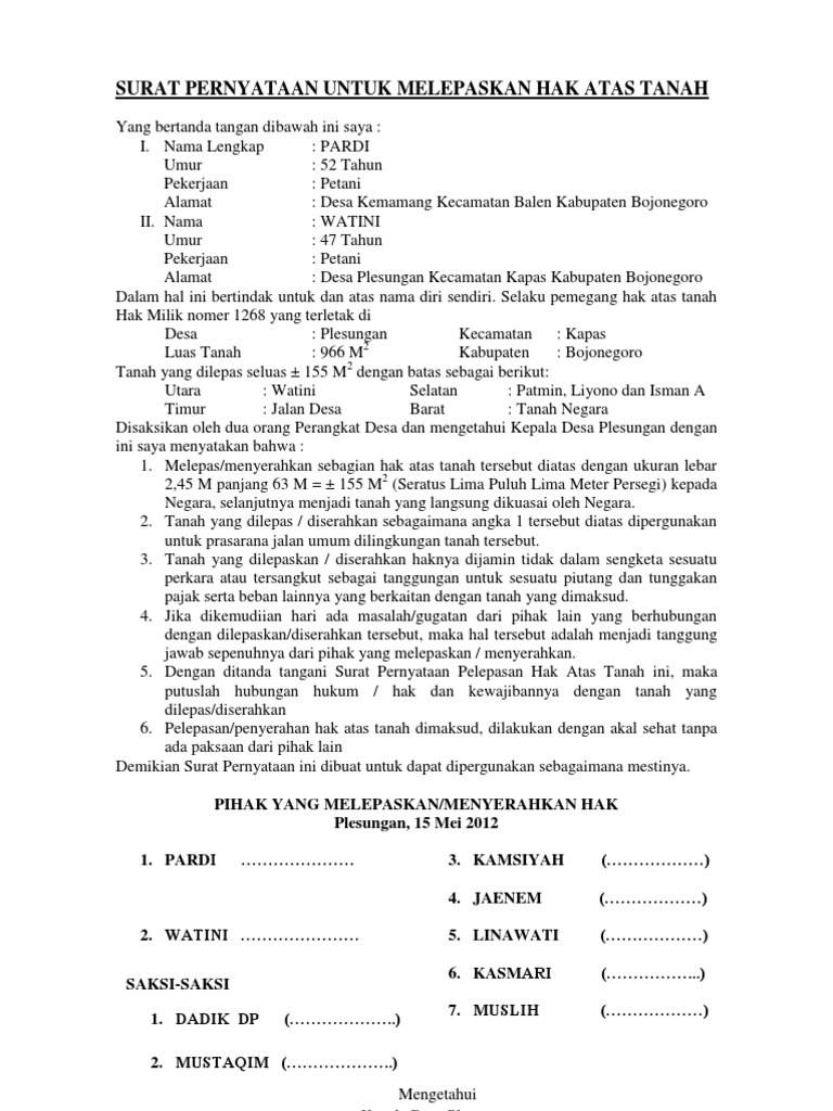 Surat Pernyataan Pelepasan Hak Atas Tanah - Kumpulan Contoh Surat