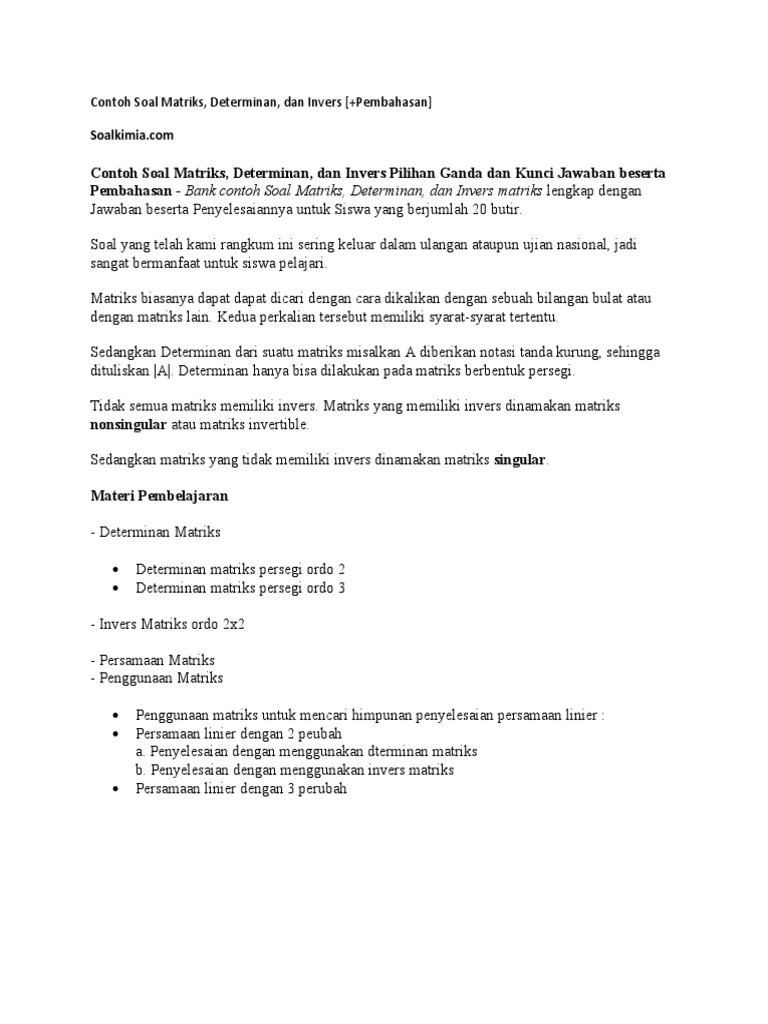 Contoh Soal Matriks, Determinan, dan Invers Pilihan Ganda dan …