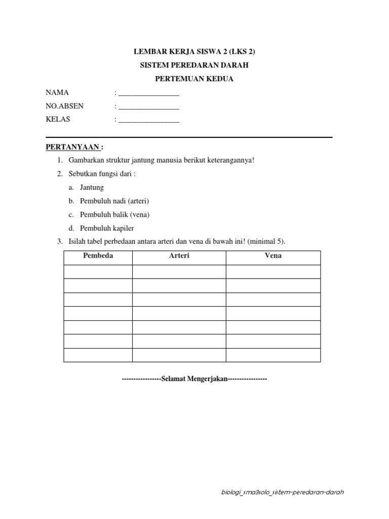 Lembar Kerja Siswa 2 (Lks 2) Sistem Peredaran Darah Pertemuan Kedua
