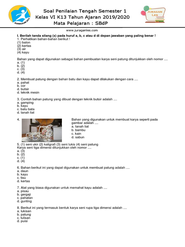 Soal PTS / UTS SBdP Kelas 6 Semester 1 K13 Terbaru Tahun 2019/2020 ~ Juragan Les