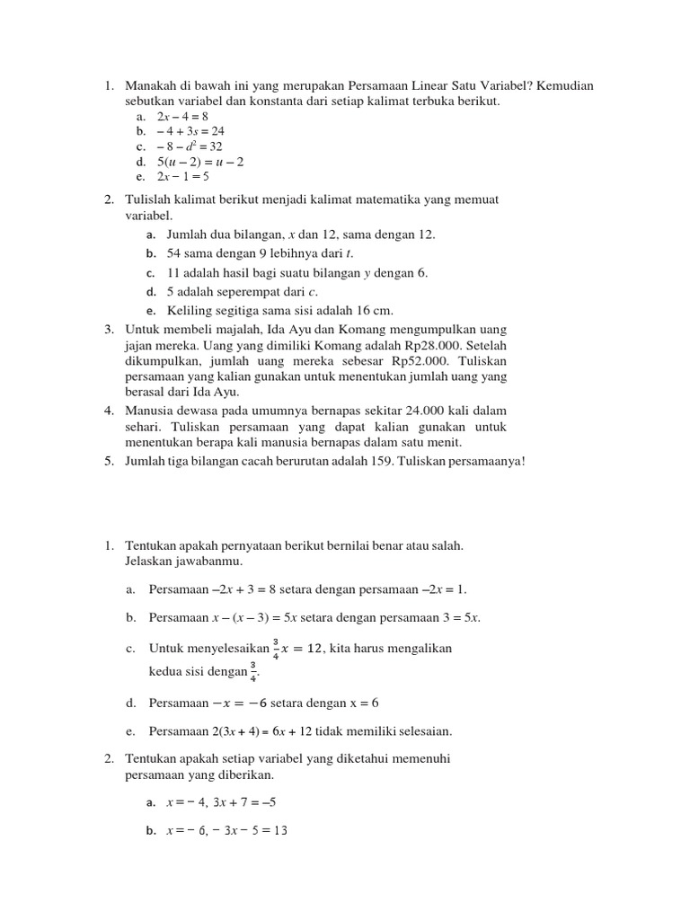 Kelas 7.Ayo Kita Berlatih 4.1 no 1 2 bab 4 persamaan pertidaksamaan linear matematika semester 1 - YouTube