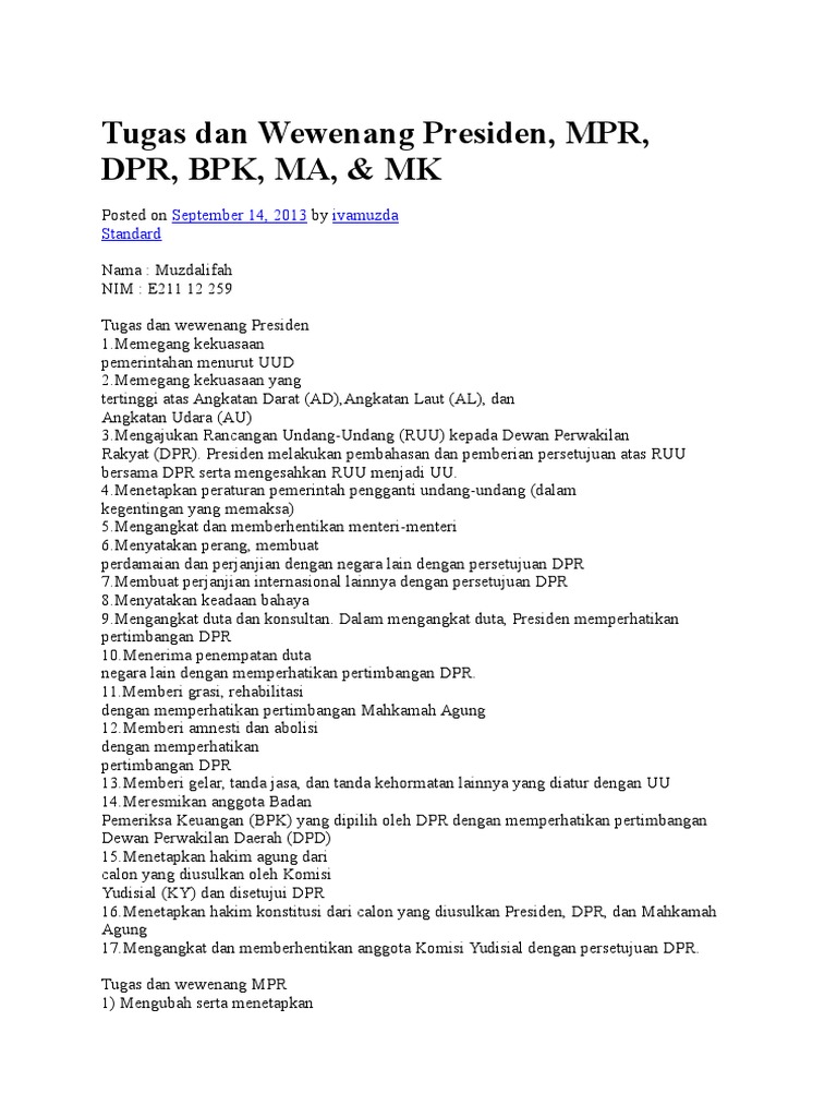 Nama, tugas dan wewenang presiden, wakil presiden, mpr, dpr, ma, mk, …