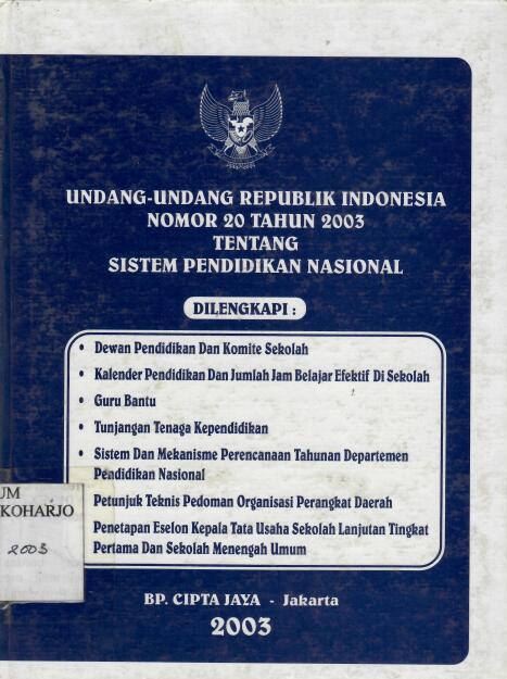 Jual BUKU UU RI N0 20 TAHUN 2003 TENTANG SISDIKNAS ORI in - Kota …