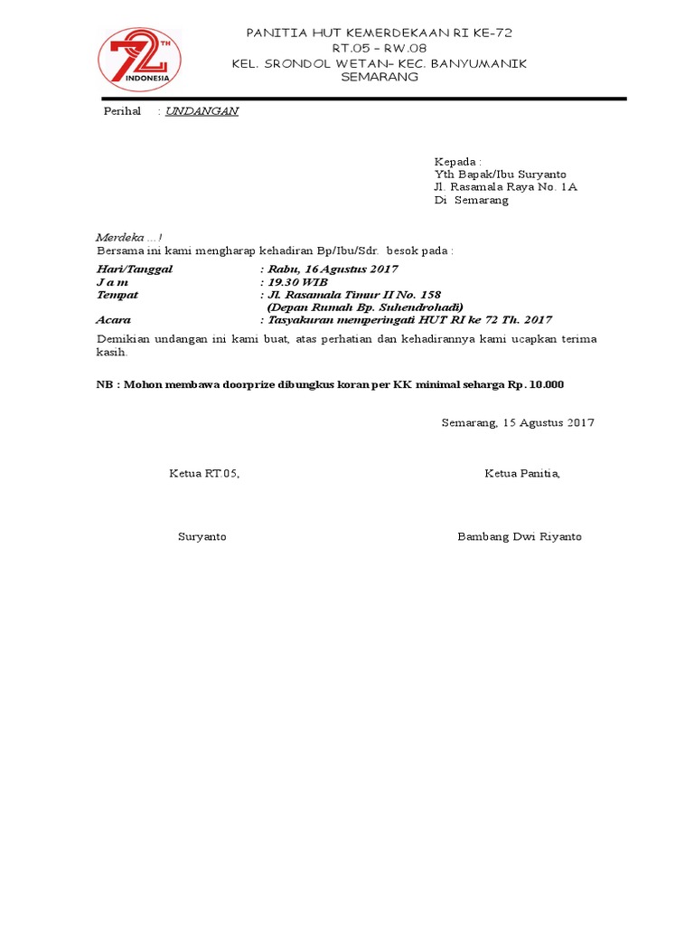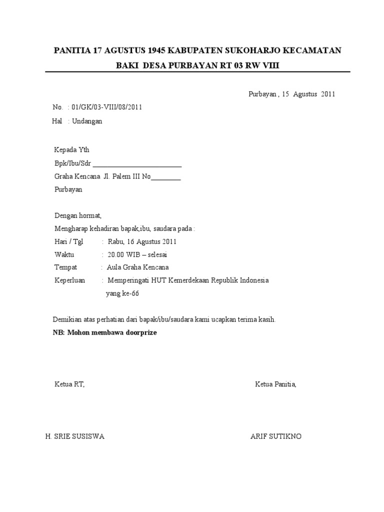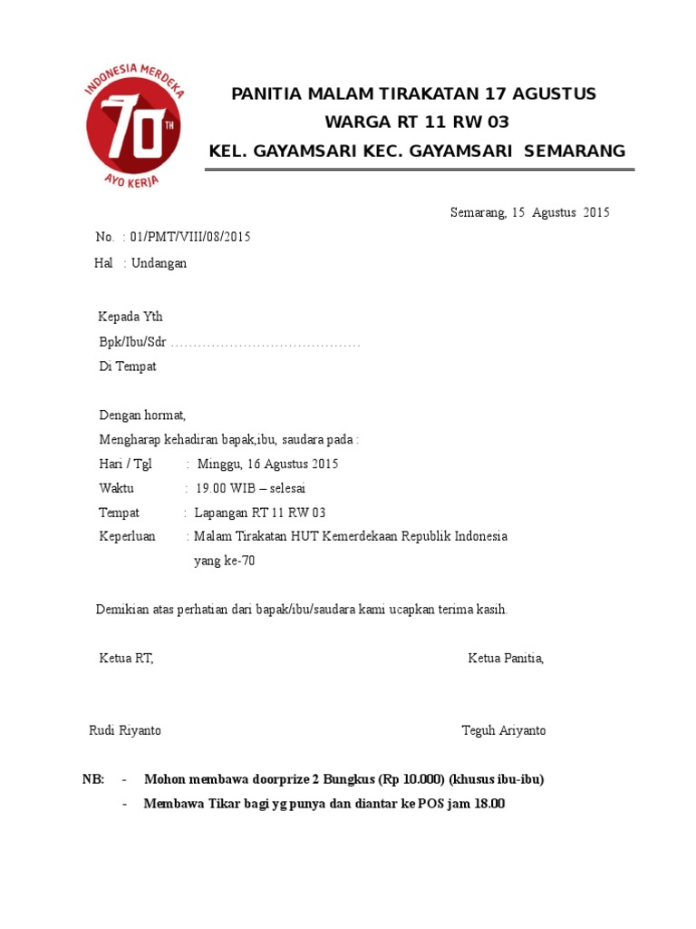 Contoh Surat Undangan Resmi Rapat Ketua RT HUT RI | Belajar Office
