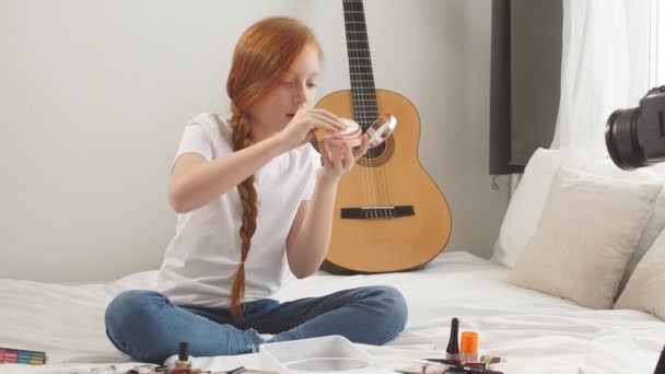 Gadis muda berambut merah duduk di depan kamera dan berbicara …