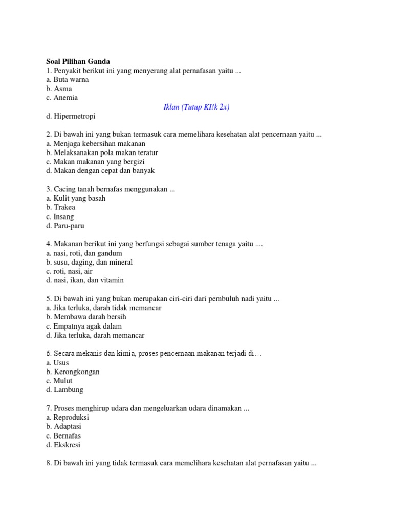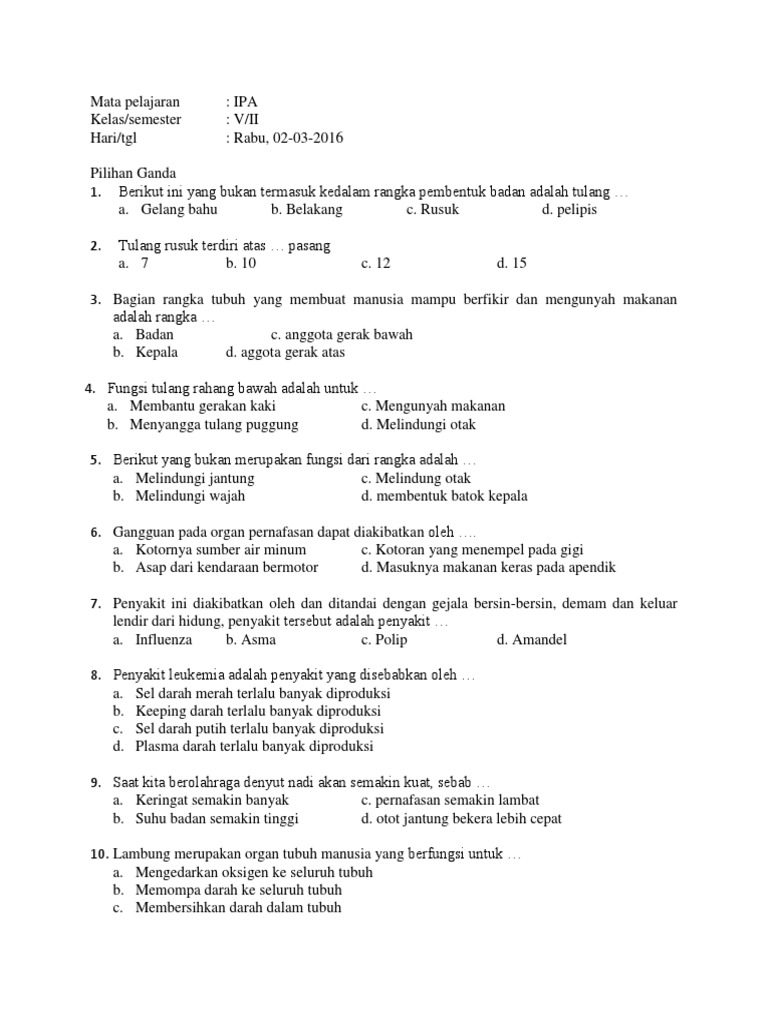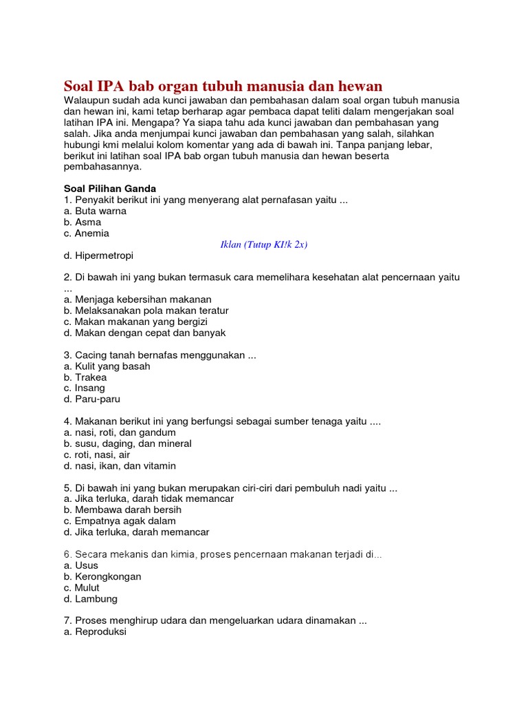 Soal IPA bab organ tubuh manusia dan hewan