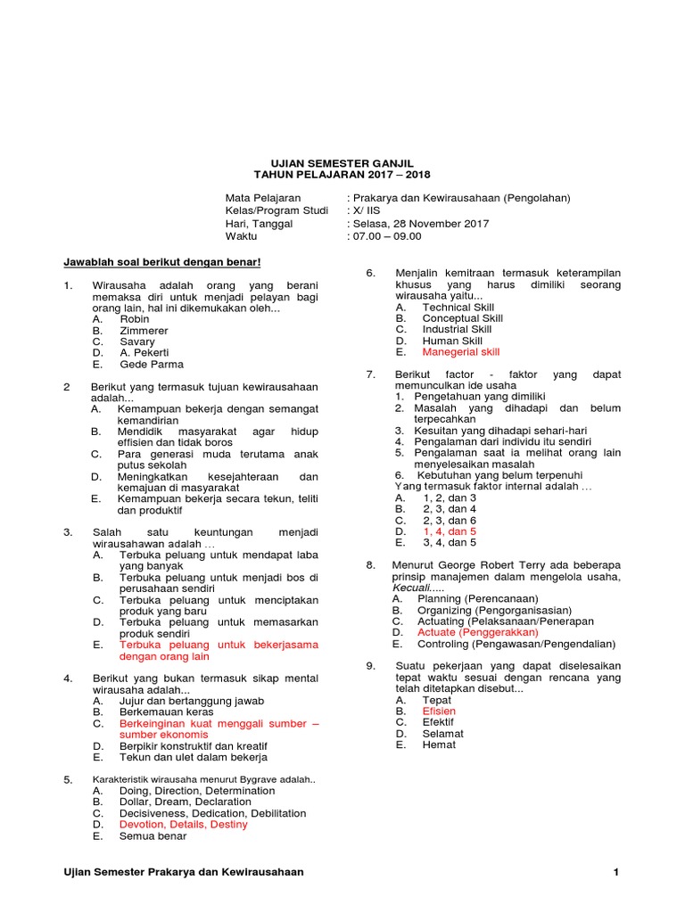 PDF) Kunci Jawaban Soal Semester Prakarya Kewirausahaan Kelas X | HERY WIBOWO - Academia.edu