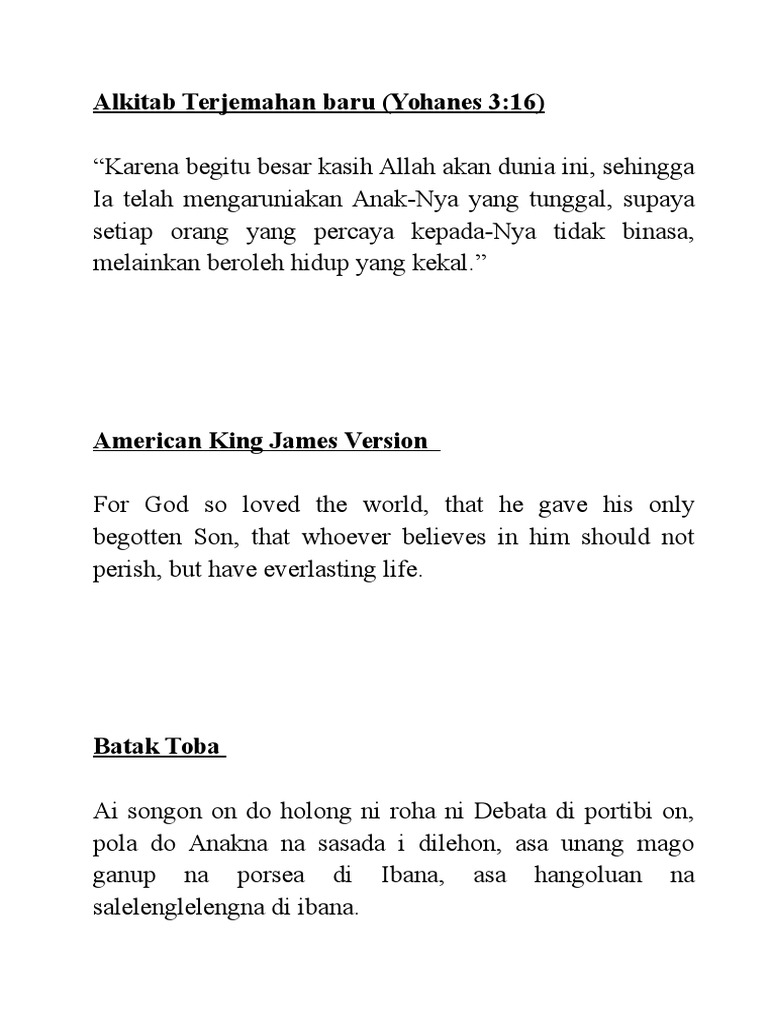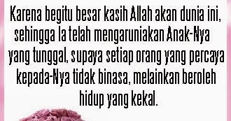 Yohanes 3:16 Karena begitu besar kasih Allah akan dunia ini, sehingga Ia telah mengaruniakan Anak-Nya yang tunggal, supaya setiap orang yang percaya kepada-Nya tidak binasa, melainkan beroleh hidup yang kekal. | Alkitab